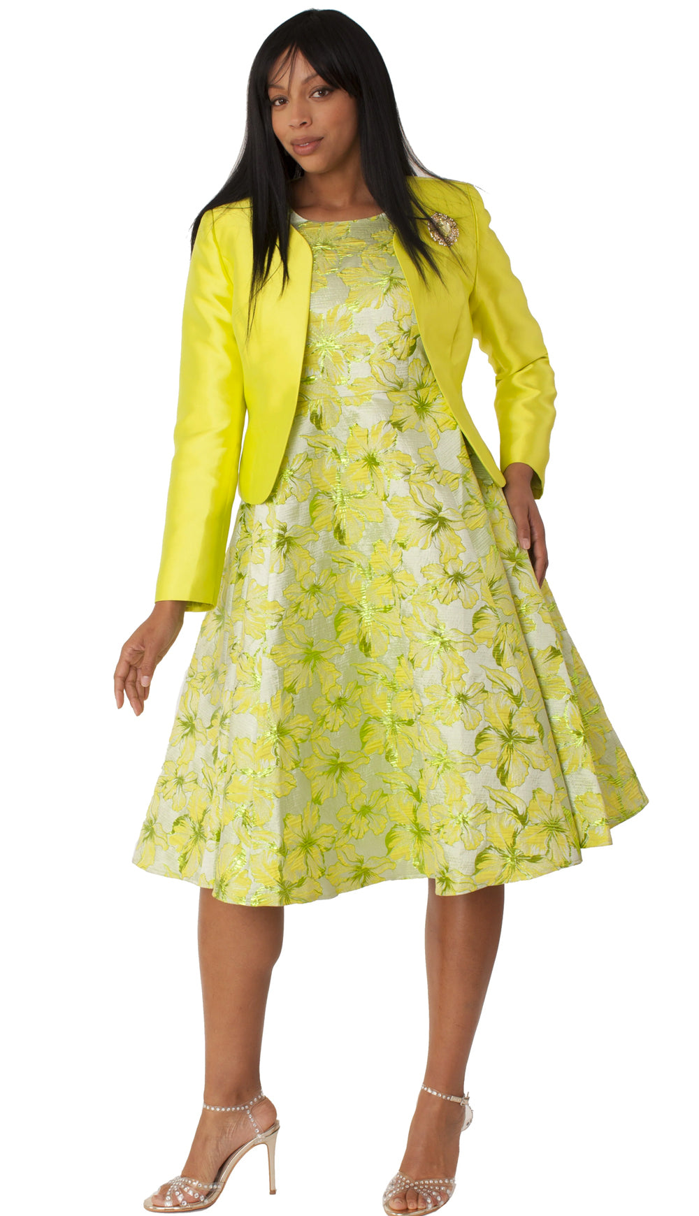 Two piece fit and flare dress in floral brocade, cap sleeve, solid color jacket and rhinestone brooch.
