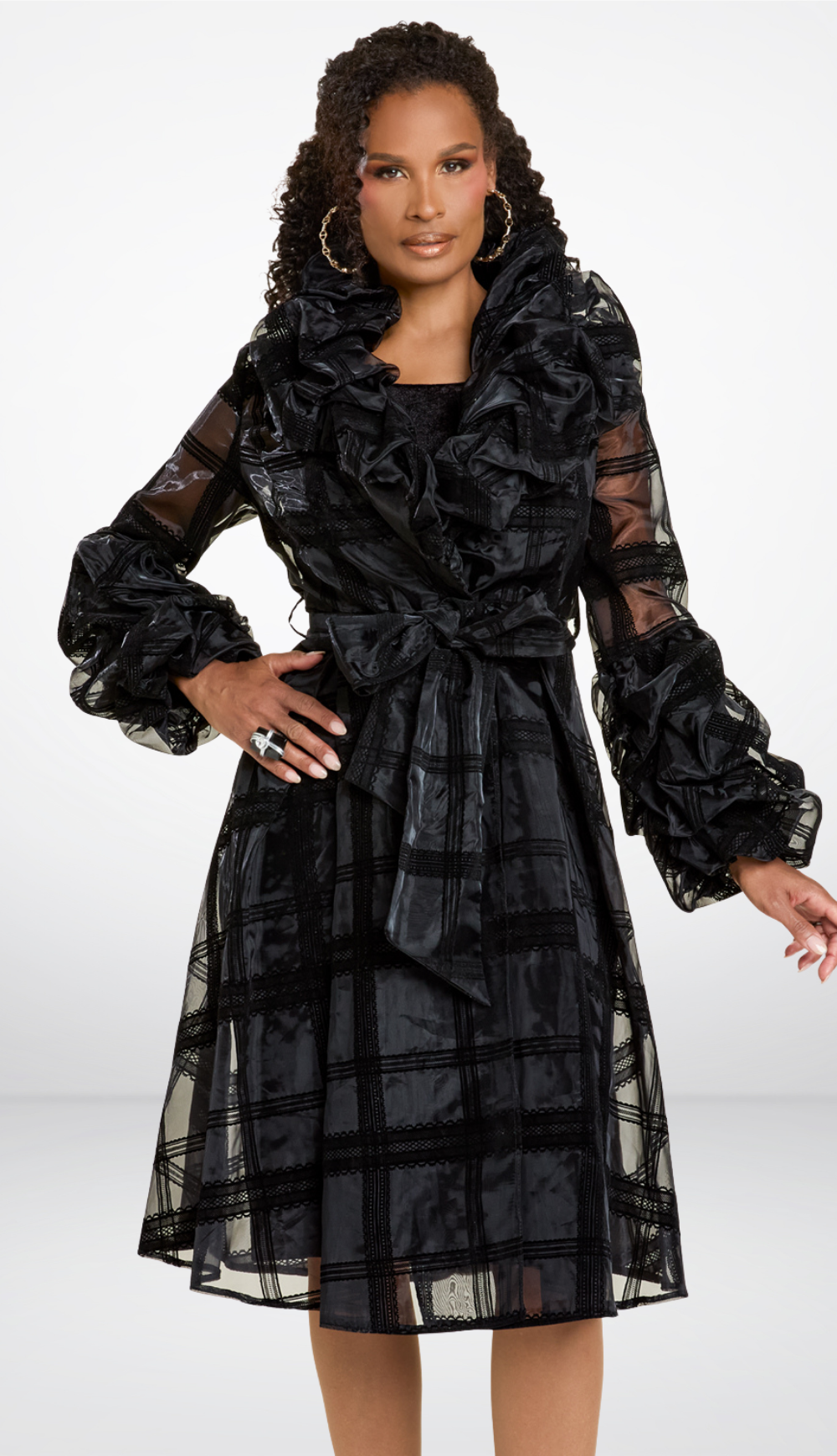 Two piece long dress in velvet with organza jacket, windowpane ribbon pattern, ruffle collar and waist sash.
