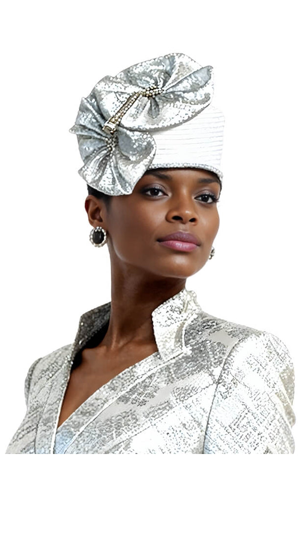 Two piece women’s suit in textured novelty fabric with diamond pattern, rhinestone clasp, high-low peplum jacket and skirt.