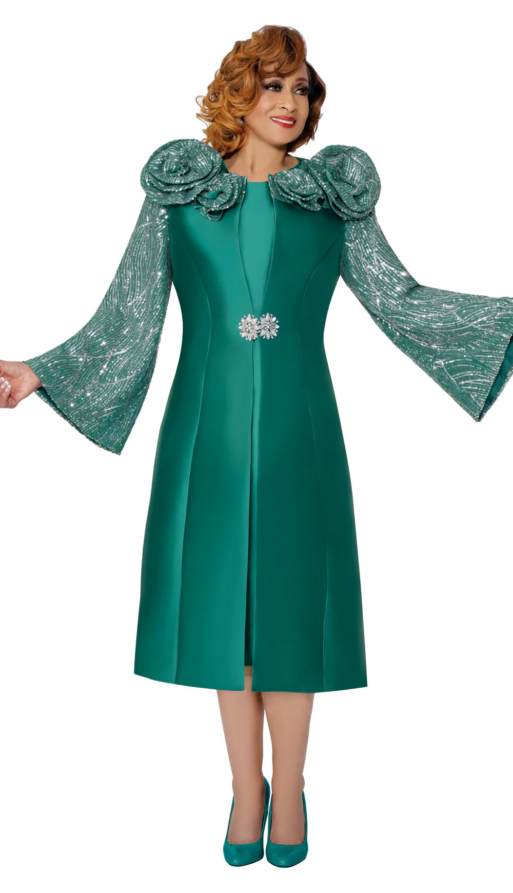 Two piece dress in twill with duster jacket, sequined bell sleeve, rhinestone clasp and fabric rosettes.