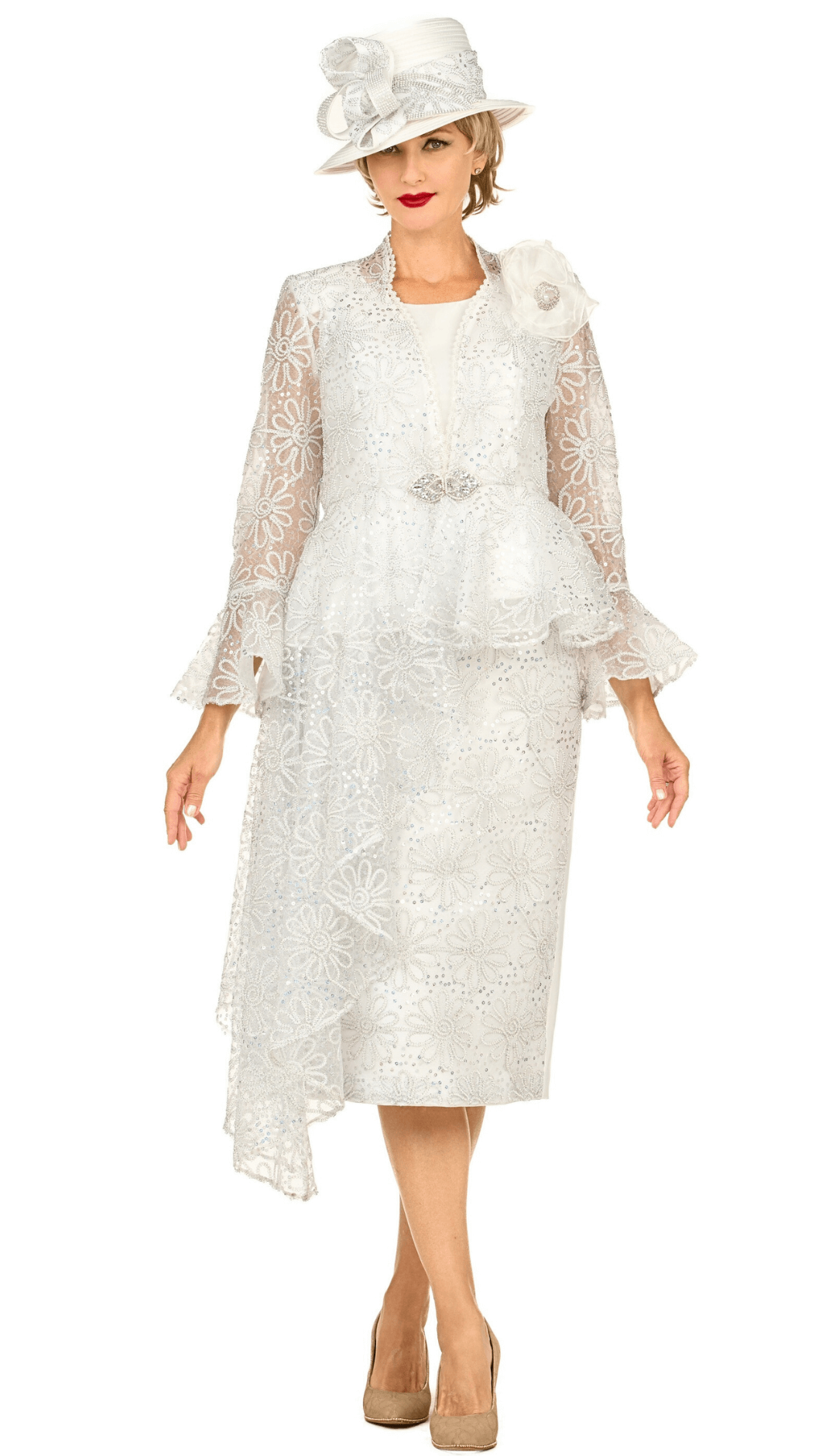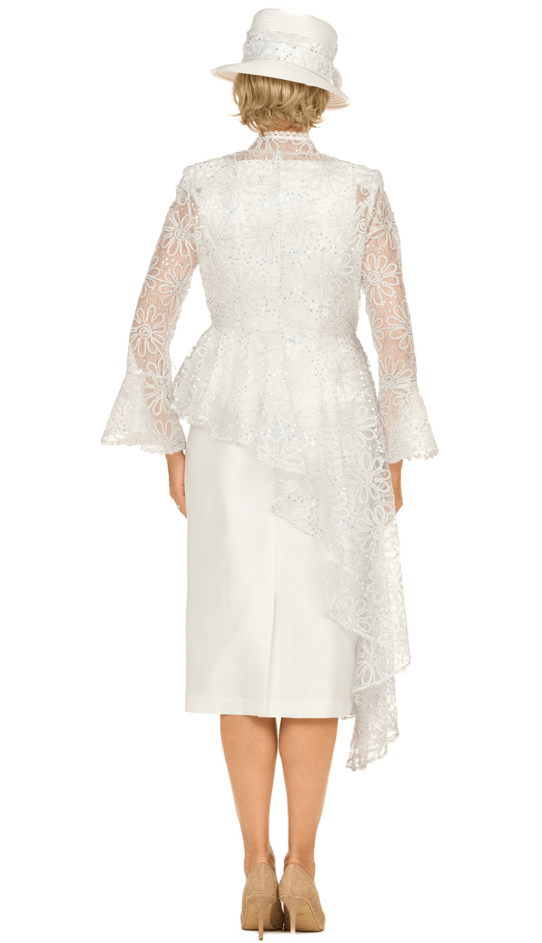 Three piece women's suit in lace with asymmetric jacket, peplum waist, flounce sleeves, rhinestone clasp, floral brooch, cami and skirt.