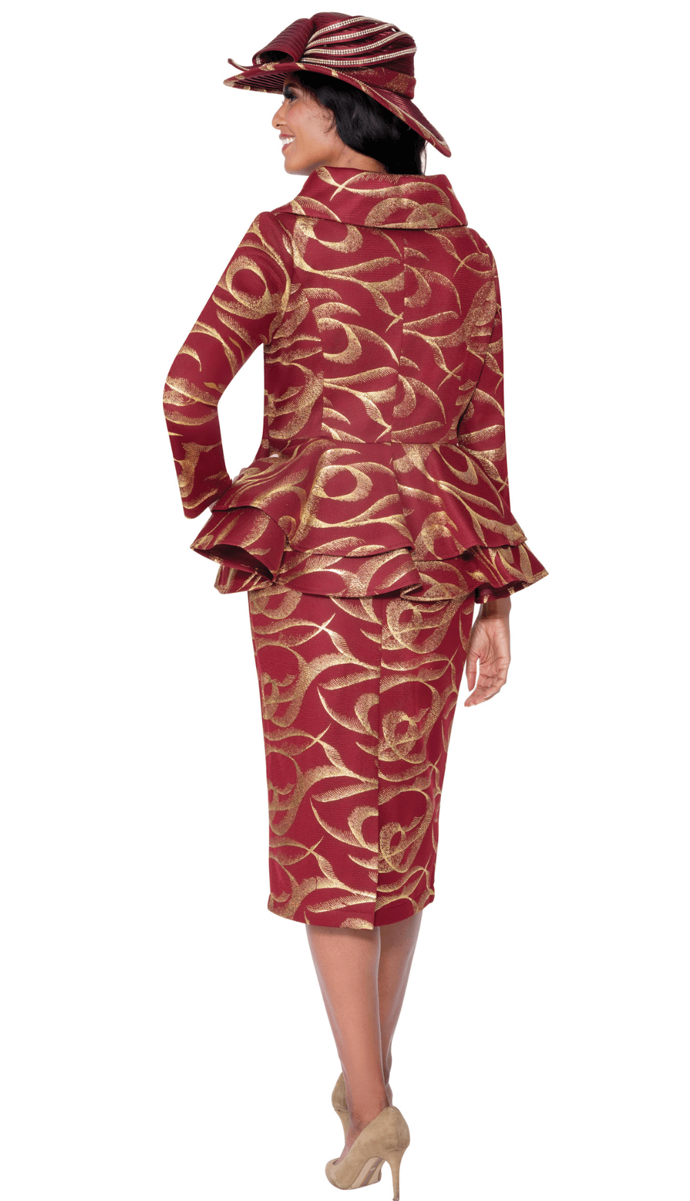 Two piece women’s suit in mesh with metallic swirl pattern, rhinestone buttons, tiered peplum jacket and skirt.