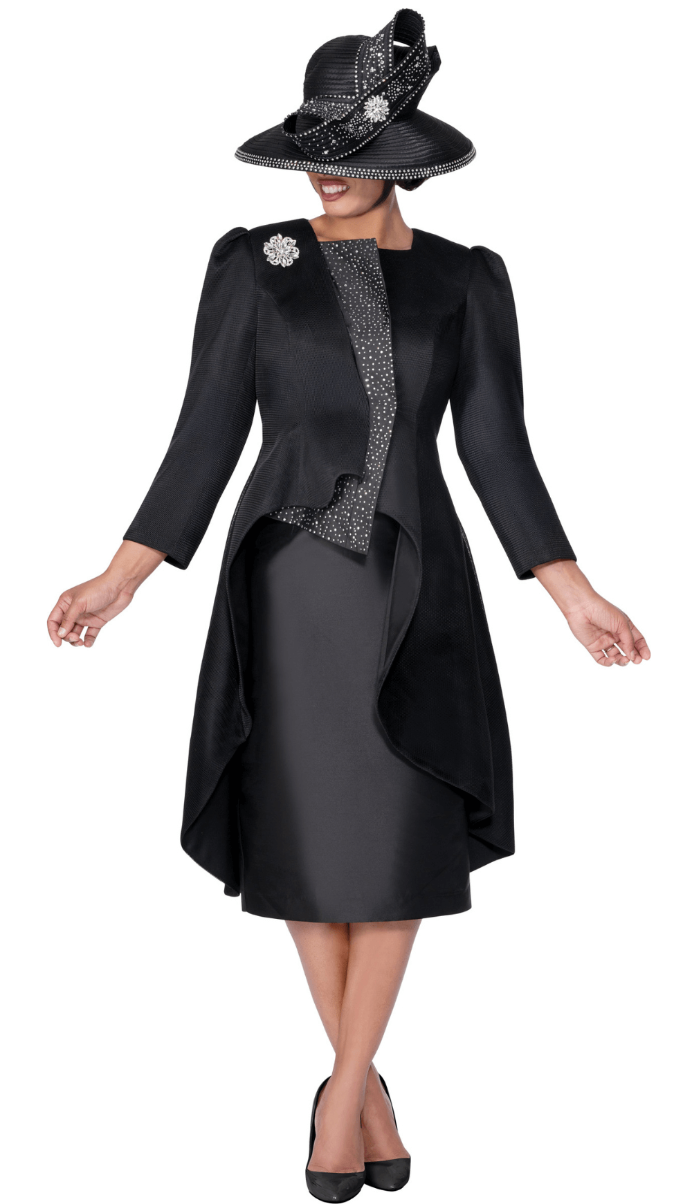 Two piece women’s suit in mesh with rhinestone embellishment, rhinestone brooch, high-low jacket and skirt.