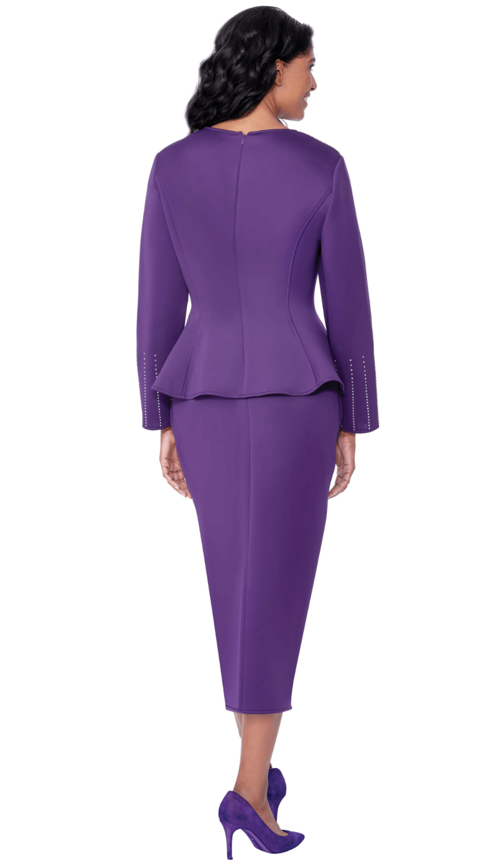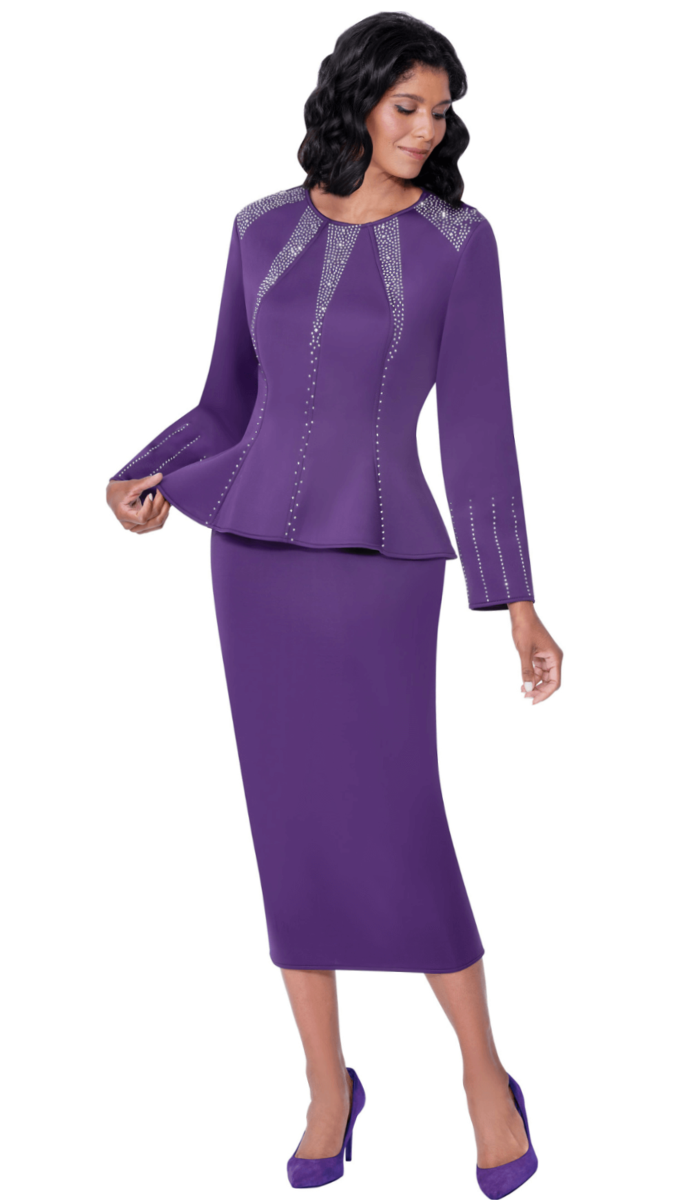 Two piece skirt set in light scuba knit with crystal embellishment, paneled top and skirt.