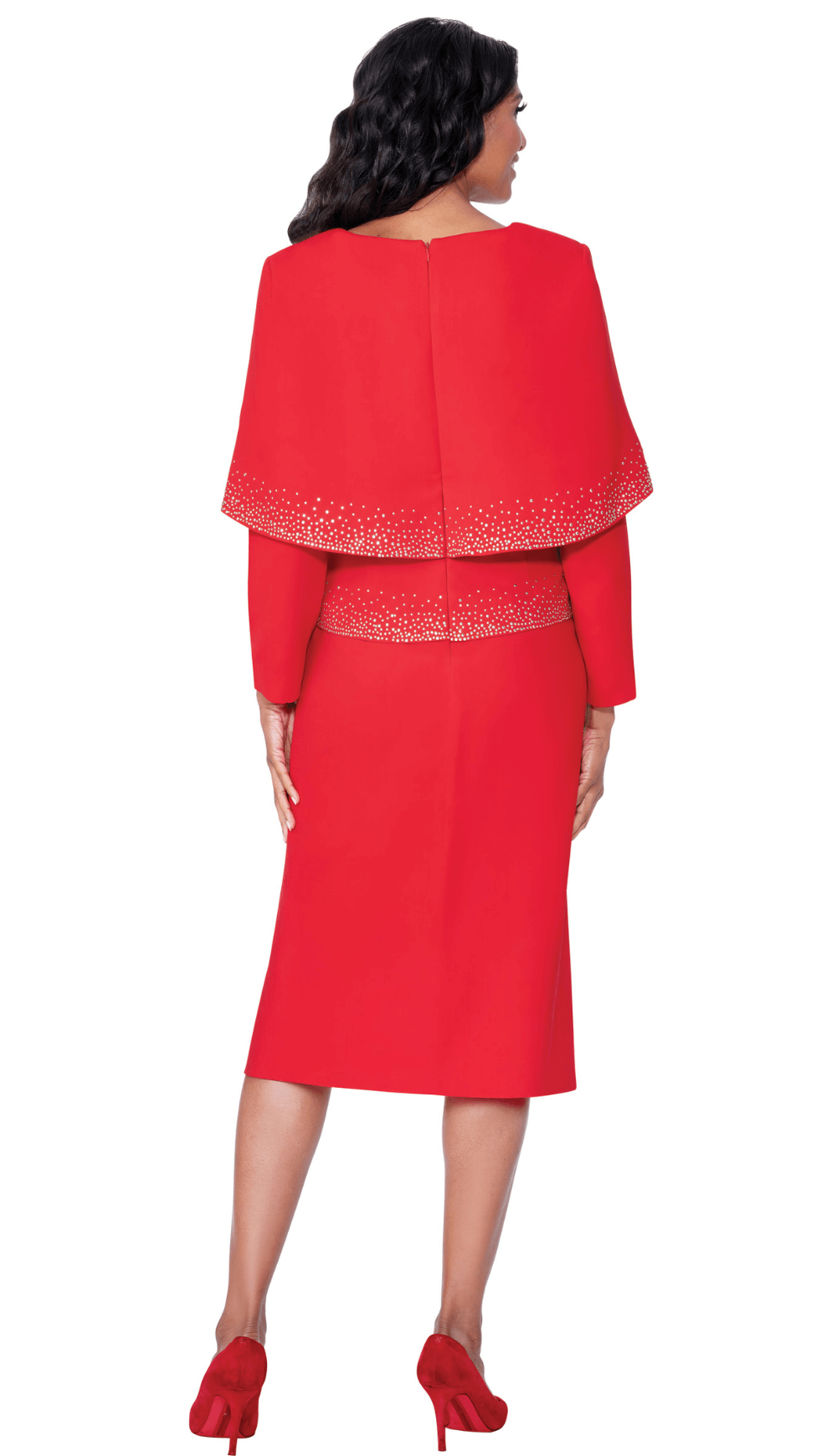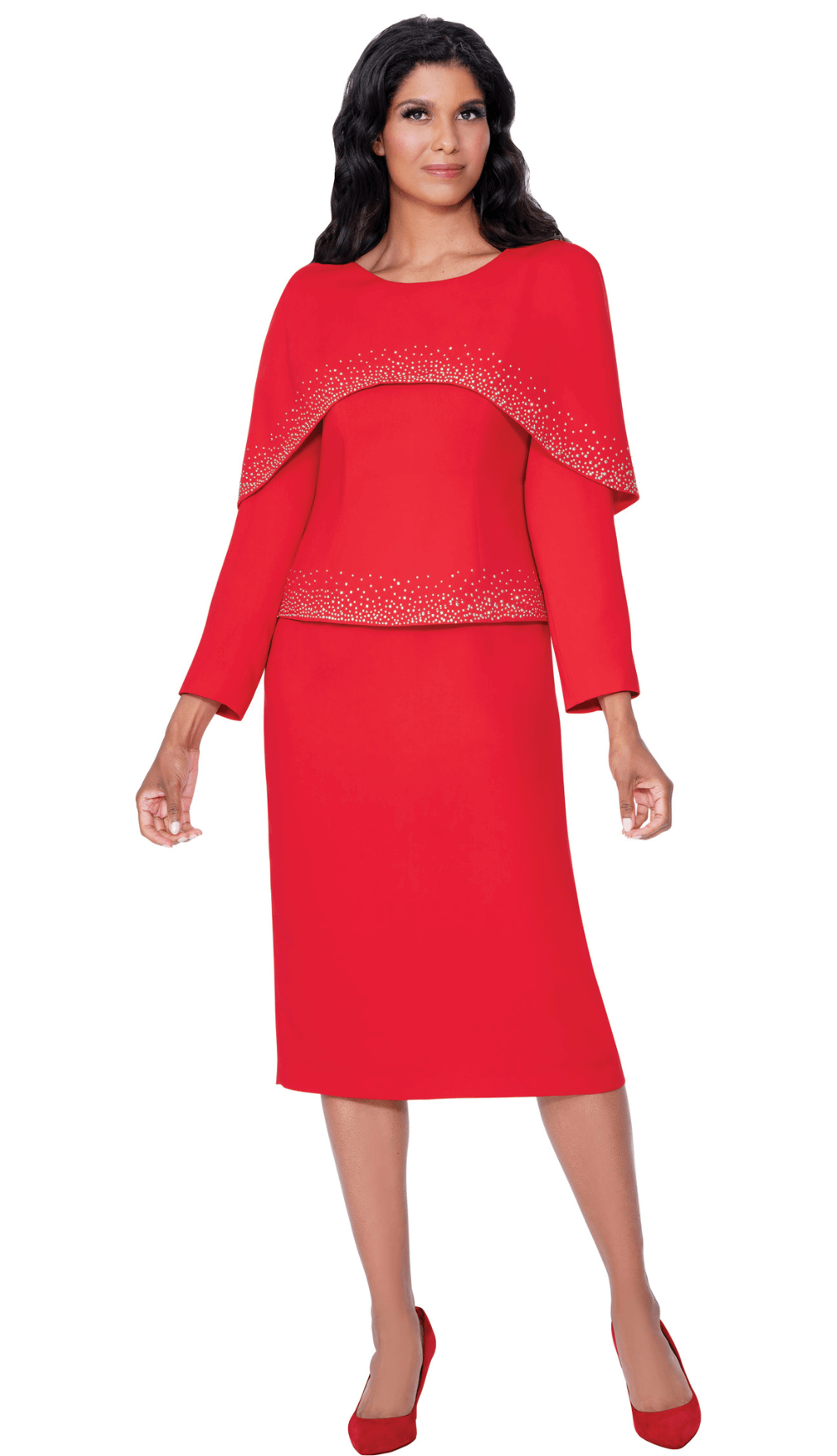 Two piece skirt set with capelet, crystal embellishment, top and skirt.