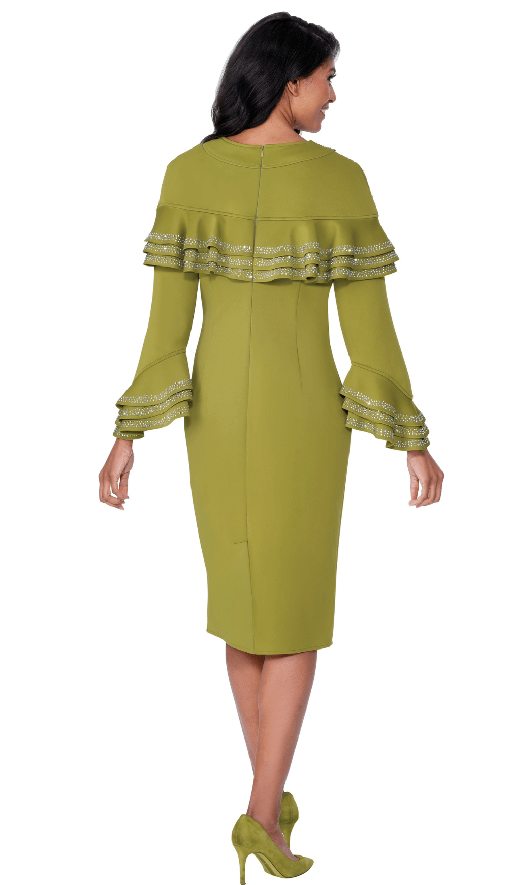 One piece sheath dress in light scuba knit with rhinestone embellishment, ruffled shoulder and flounce sleeve.