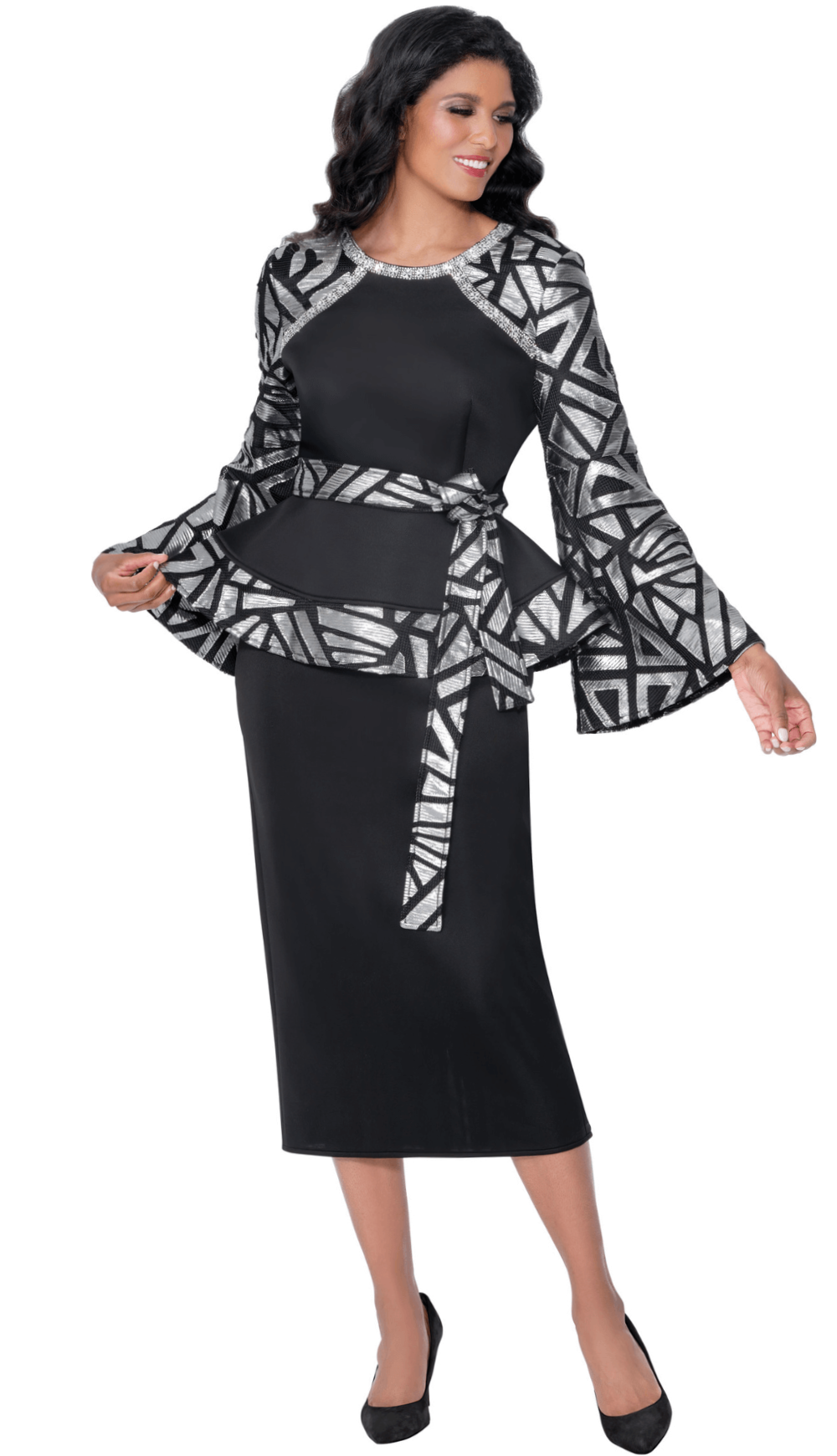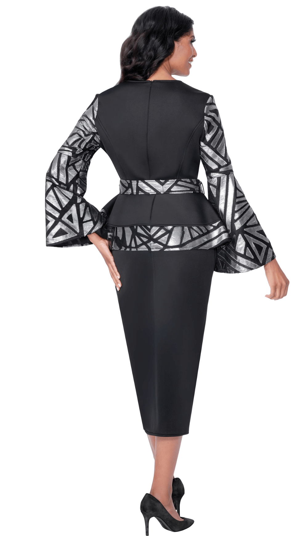 Two piece skirt set in light scuba with metallic geometric pattern, bell sleeves, crystal embellishment, waist sash, top and skirt.