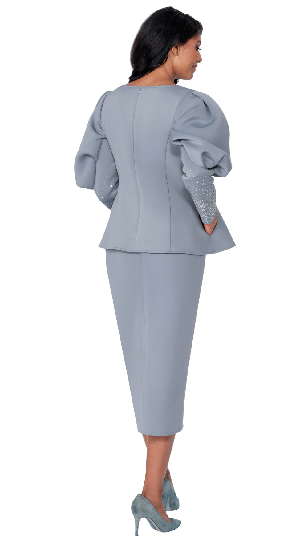Two piece skirt set with puffed sleeve, crystal embellishment, peplum waist, pockets, top and skirt.
