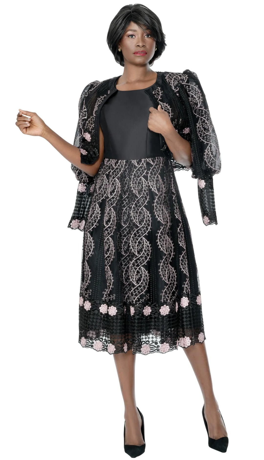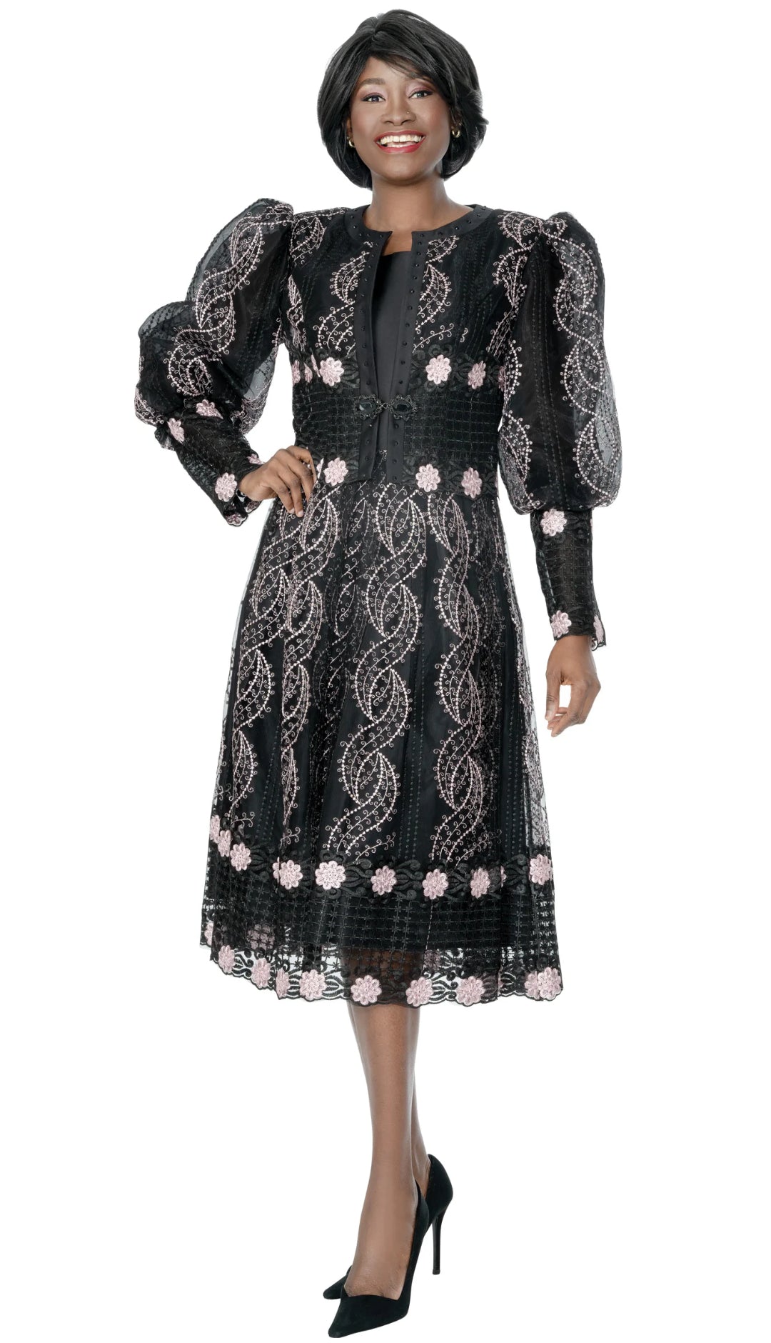 Two piece fit and flare dress in embroidered lace overlay with pleated waist, scallop hem and bolero jacket with rhinestone clasp.